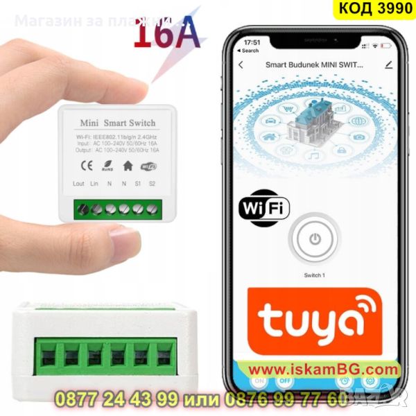 ➤ Tuya WiFi е светлинен модул, чиято инсталация е лесна. Контролер за осветление за ON/OFF управление на: LED ленти чрез мобилни устройства, стенни лампи и таванни лампи.