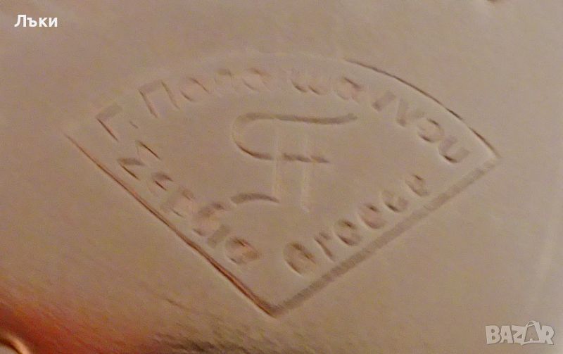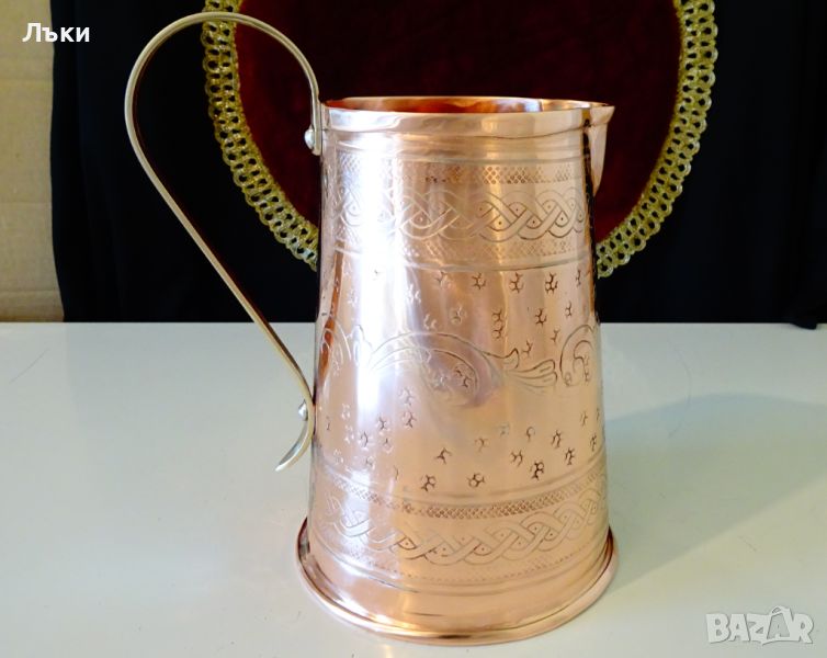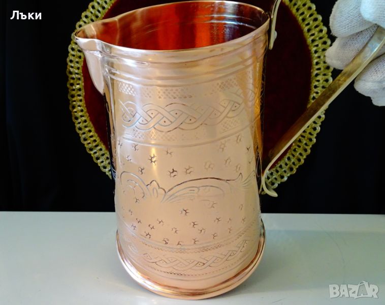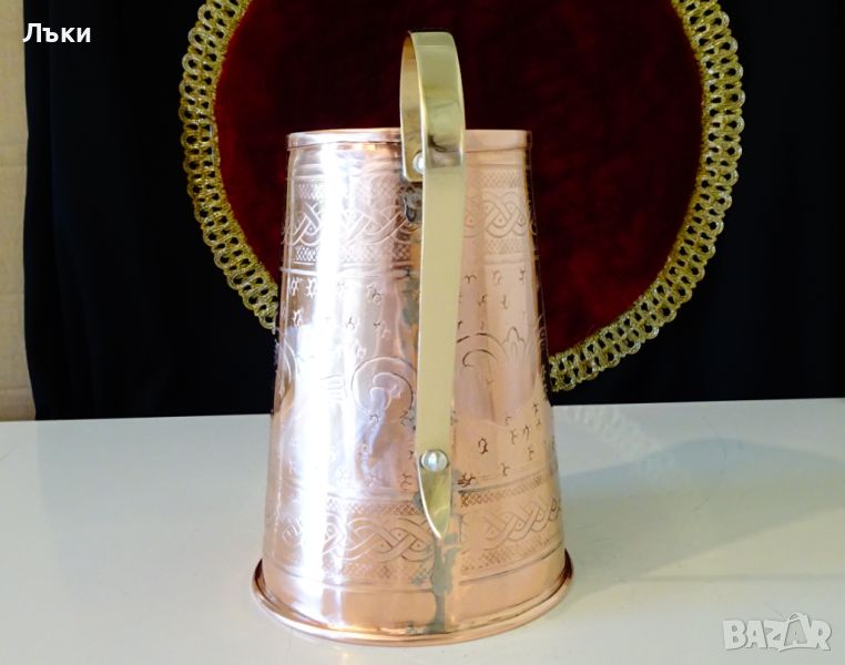 червена мед,маркирана от производителя.Датира от 1996 година.Декорирана с красиви ръчно ковани орнаменти.Има стабилна дръжка от златен бронз.Вътре не е калайдисана,подходяща освен за вино и за медна вода.Височина 17.5 см.,диаметър 11.5 см.,тегло 390 гр.Вместимост 1 литър.