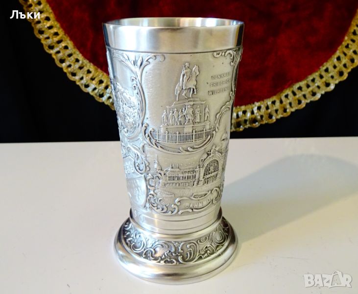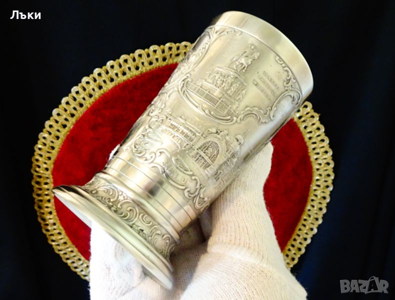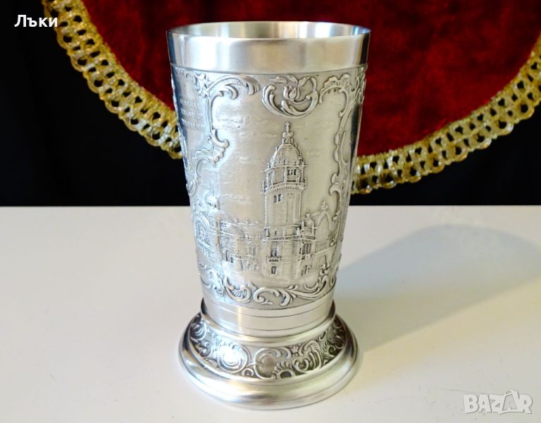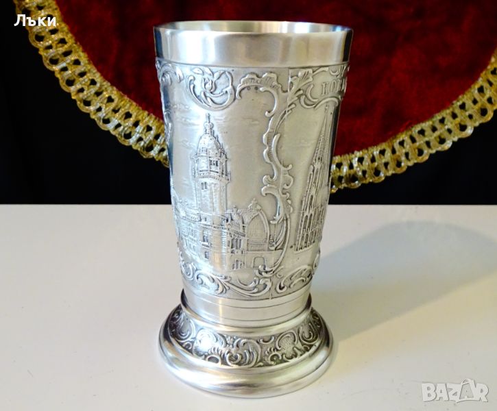 95% калай и 5% сребро,маркирана.Декорирана с релефни изображения на различни архитектурни забележителности от град Кьолн и барокови орнаменти.Височина 10.5