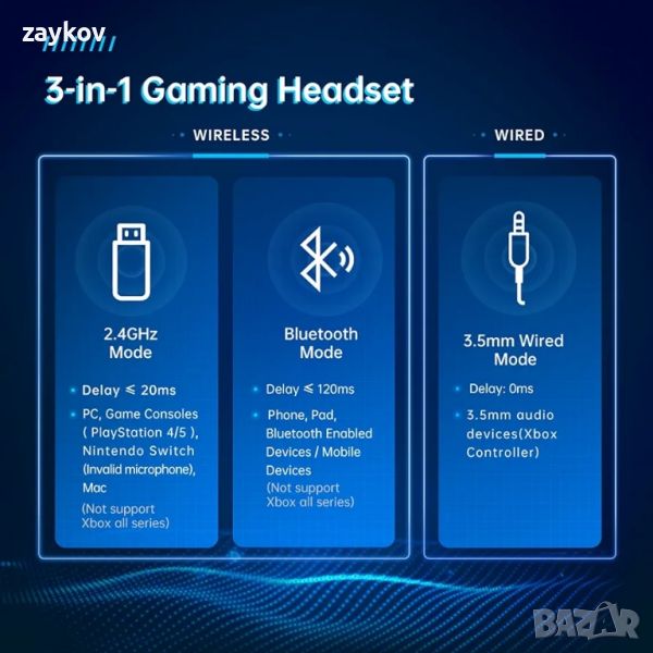 Начини за свързване 3 в 1 и съвместимост между платформи: Безжичните слушалки Captain 300 за компютър поддържат ниска латентност, 2,4 GHz USB донгъл без загуби и най-новата стабилна Bluetooth 5.2 връзка, като същевременно поддържат 3,5 мм режим на кабелна връзка. Уникалният дизайн на връзката 3 в 1 (оборудван с USB донгъл и 3,5 mm жак кабел) прави тази безжична слушалка широко съвместима с PS5, PS4 контролер, PC, Mac, телефон, подложка, Nintendo Switch (невалиден микрофон); Xbox Series поддържа само 3,5 мм кабелен режим.