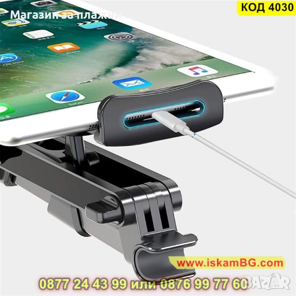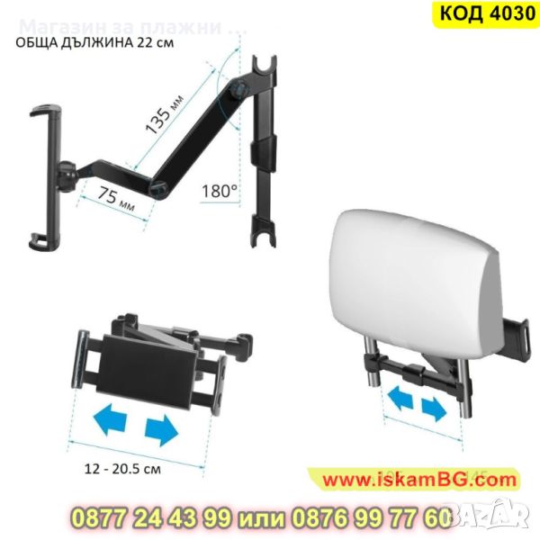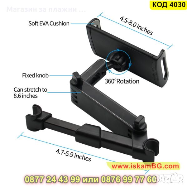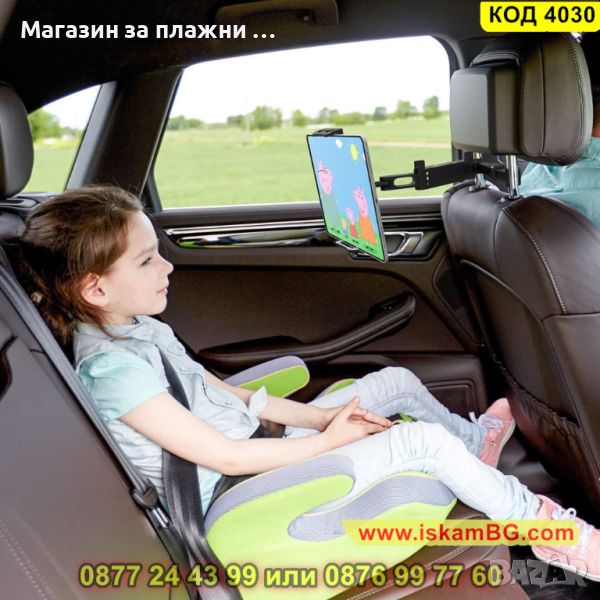 Стойката е предназначена специално за задната част на седалката на автомобила и позволява на пътниците, които се возят отзад да гледат филми, клипове или да слушат музика, без да се налага да използват ръцете си. Стойката се разтяга и е подходяща за телефони с размери от 4 до 11 инча. Върти се на 360 градуса, а рамото се разтяга до 27,50 см. за максимално удобство и благодарение на нея пътуването минава бързо и забавно.