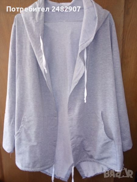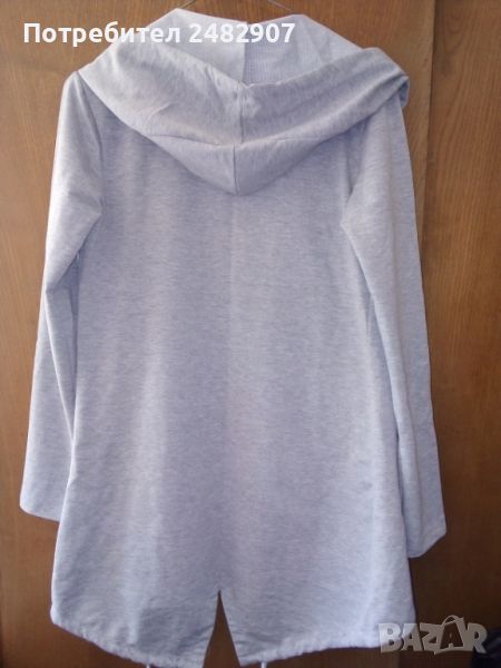 Сиво дамско дълго горнище с качулка, размер М. Съдържа 50 % памук, 45 % полиестер и 5 % еластан. Ширина в раменете - 38 см, ширина под мишниците - 44 см, дължина от рамото до долу - 83 см, дължина на ръкава от рамото - 58 см, ширина на ръкава в долната част - 11 см. Много запазено, почти не е използвано.