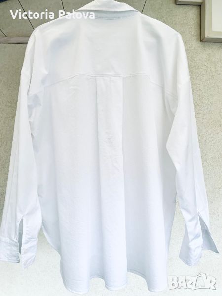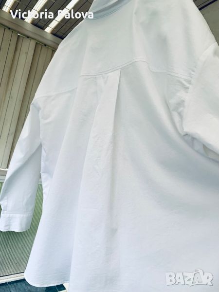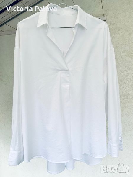Много красива широка свободна кройка бяла блуза -риза. Паднало рамо - 61см, ГО - 64см, дължина отпред - 66см, отзад - 75см., заоблен долен край, цепки отстрани, ръкав - 50см. Отпред и на гърба има плохи, които придават на ризата още по-свободен силует.