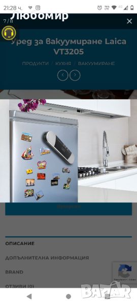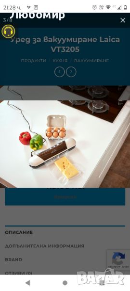 ЗАЩО ДА ЗАКУПИМ машина за вакуумиране / уред за вакуумиране Laica VT3205. Бързо и лесно домашно консервиране с машина за вакуумиране / уред за вакуумиране Laica VT3205. Вакуумирането на различните видове храни става за секунди, чрез опаковане в херметически затворени пликове. Всмукателна сила e -0.6 бара и с бързина на изсмукване 9 л / мин. Laica VT3205 вакуумира и запечатва напълно автоматично, чрез натискане на един бутон. Вакуумираните храни остават свежи за по-дълго време, защото не се окисляват, и не позволяват развитието на гъбички и бактерии в плика. Храната запазва свежестта си за дълго време и може да се съхранява замразена с месеци. С машина за вакуумиране Laica VT3205 ще запазвате за по-дълго време хранителни продукти като сушени меса, суджуци, луканки, пъстърми. Laica VT3205 е предназначена за постигане на добри резултати в домашни условия.