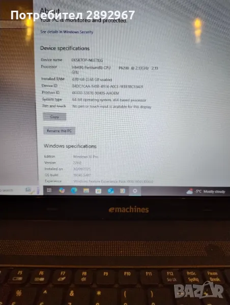 Добре работещ ACER eMachines E732 Компютъра е в много добро състояние, единствено батерията е за смяна ако изобщо някой, някога реши да го ползва на батерия - издържа 10 .. 15-тина минути след изключване на захранването, колкото да си затворите приложенията. Операционната система е: Windows 10 Pro.