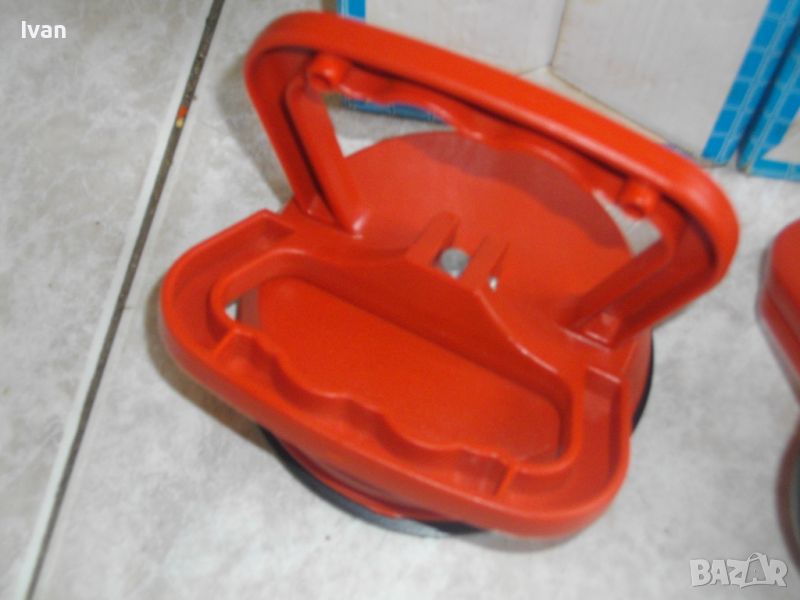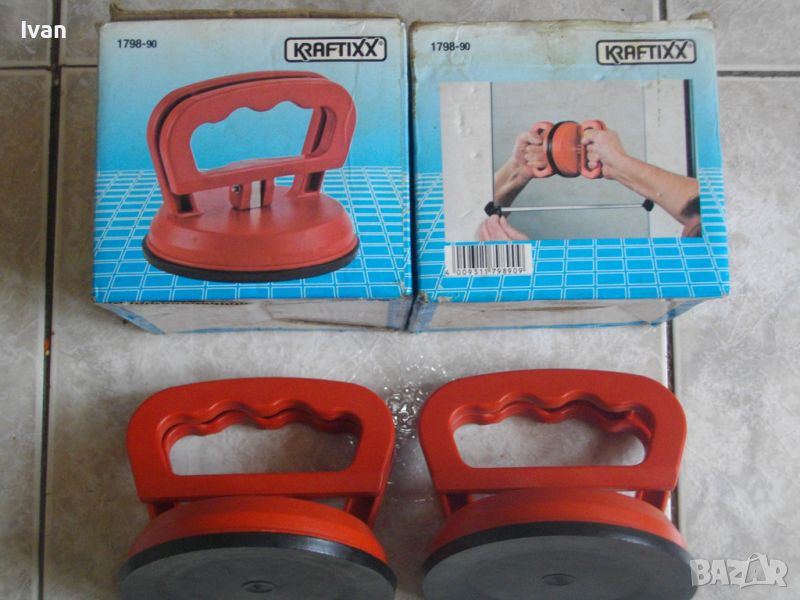 ОПИСАНИЕ на нова немска лапа за пренасяне на стъкло - 59,00 лв за 1 бр. Съвсем нови лапи за пренасяне и монтиране на стъкло.Цената е за 1 брой инструмент.Лапите на немско оригинално производство,упоменато на фабричните опаковки.Марка и модел-.Kraftixx 1798-90.Вакумни са,с размер на вакумната гума-работен плот-ф115мм.В отлично техническо състояние-държат здраво,и при въртене и резки движения.Лапата е предназначена за работа с листово стъкло и метал.Надеждната фиксация върху стъклото помага за преместване и монтиране на прозоречни стъкла и стъклопакети.Корпуса на инструмента е от здрава пластмаса.Дръжките са здрави,големи и удобни за ръката.Лапата е в оригиналната си немска фабрична опаковка.