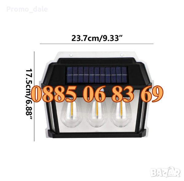 Соларна лампа с двупосочно осветяване за фасада и красив визуален ефект. Тя ще освети атрактивно стената на кащата, външните стьпала или оградата на двора. Соларната лампа се зарежда през деня и автоматично се включва през нощта.