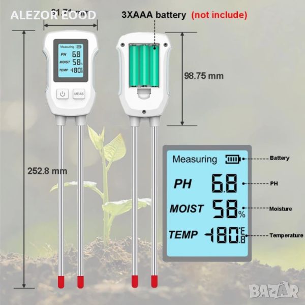 Тестер за почва 3в1 - рН метър, влагомер и термометър, 20204982