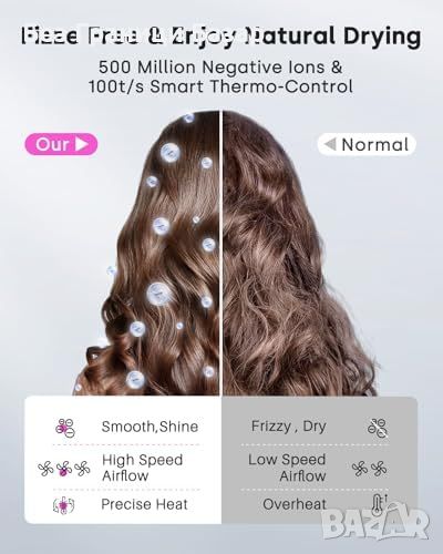 500 милиона отрицателни йони: Предотвратява наелектризирането и овлажнява косата.