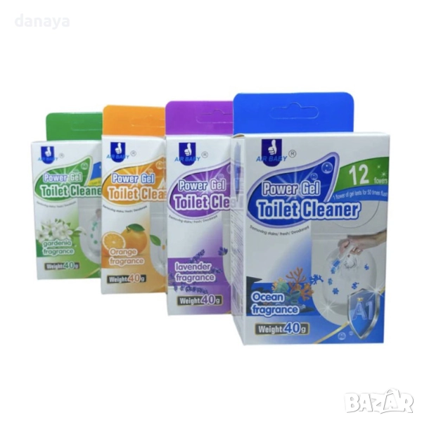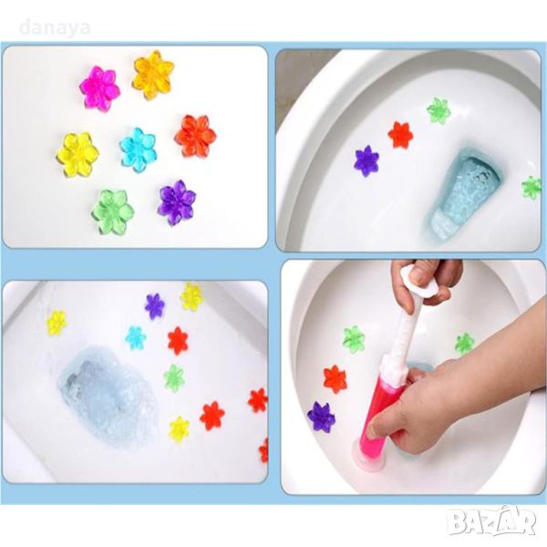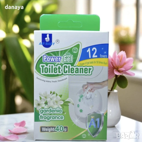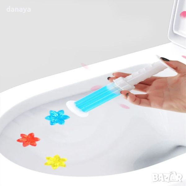 Ароматизатор за тоалетна чиния гел дискове с форма на цвете. Препаратът се поставя много лесно – само с едно натискане на указаното място. Дисковете премахват неприятната миризма, като унищожават вредните бактерии, в същото време гарантират свежест и чистота. Препаратът е ефикасен и в освежаването на санитарната керамика. Той има функцията и да предпазва тоалетните чинии от появата и разпространението на вредни вещества, събиращи се под капака. Освен това гела защитава и от натрупване на варовик, по който се задържат микроби. Предлагат се различни аромати в картонена кутия.
