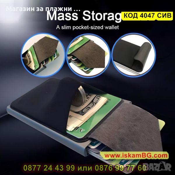 Практичен портфейл и картодържател с бутон за автоматично изкачване на карти, сив - КОД 4047 СИВ