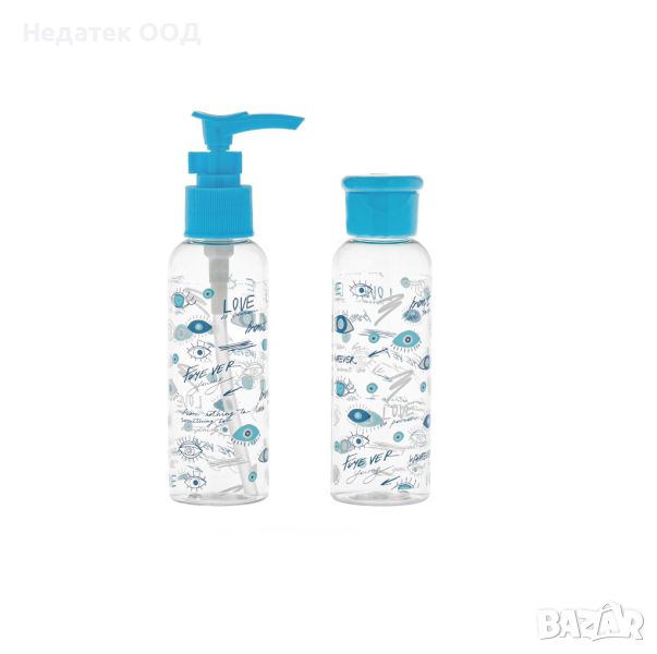 Комплект туристически бутилки, прозрачни с шарка на очите и синя капачка (винт и дозатор).