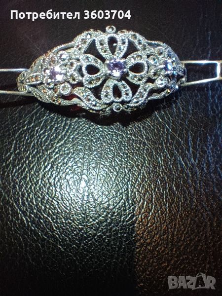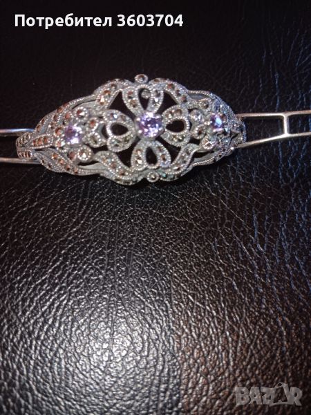 сребърна дамска гривна ръчна изработка с темпел 925 проба 28 и 15 г с множество черни диамантчета и централно три Аметист един голям два по-малки и много уникално бижу на ниска цена за дами които уважават себе си искат да бъдат индивидуални това бижу не иска нито хляб нито вода иска само да си пази да се носи и всяка изминала година вдига неговата стойност Благодаря ви за вниманието не искам да си натрапвам Разгледайте и другите мои обяви може нещо друго да ви допадне благодаря