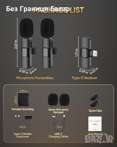 Пълен Комплект с Лекота на Употреба: 2 микрофона, 1 приемник Lightning, 2 мониторни слушалки с Type-C, преносима чанта, допълнителни антиспрей гъби, щипки и зарядни кабели.