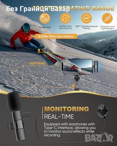 Удобство за Потребителя: Безжична връзка с дистанция до 30 метра и 8 часа време за работа, включително реално време мониторинг чрез Type-C слушалки.