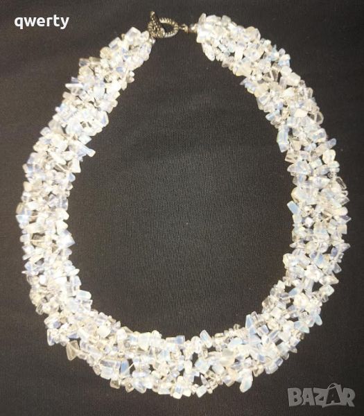 Масивно многоредово колие от лунен камък, изящно прилягащо на деколтето. Вътрешен диаметър 14,5см., външен диаметър 17,5см. Опалитът е фин, но много енергичен камък. Това е идеален камък за медитация. Опалитът подобрява комуникацията на всички нива, особено духовно. Премахва енергийните блокажи от чакрите и меридианите.