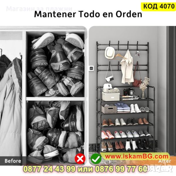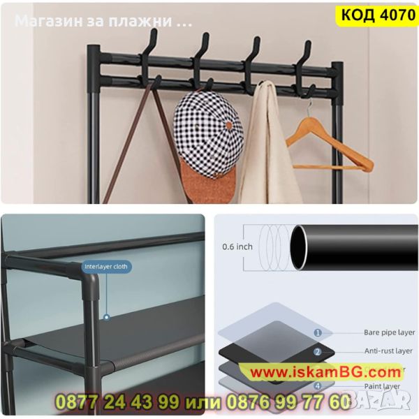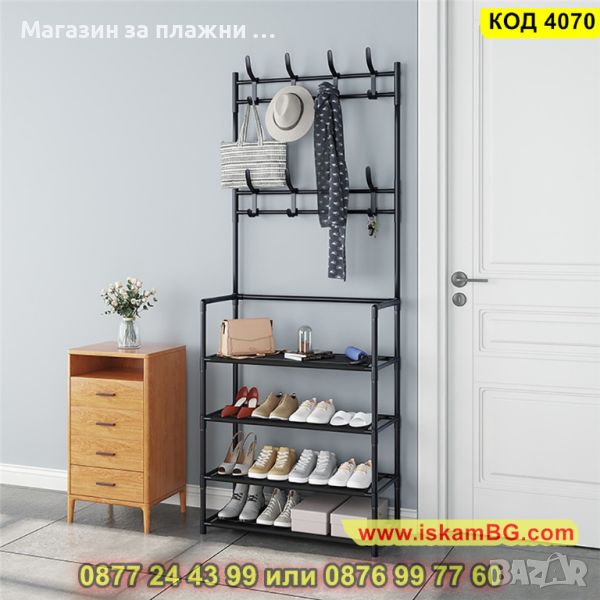 Мултифункционална етажерка, която може да се използва като стойка за обувки, закачалка за дрехи, шапки, обувки, чанти, чадъри и други.