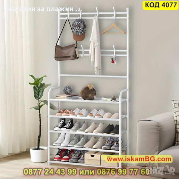 Мултифункционална етажерка, която може да се използва като стойка за обувки, закачалка за дрехи, шапки, обувки, чанти, чадъри и други.