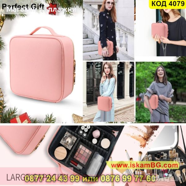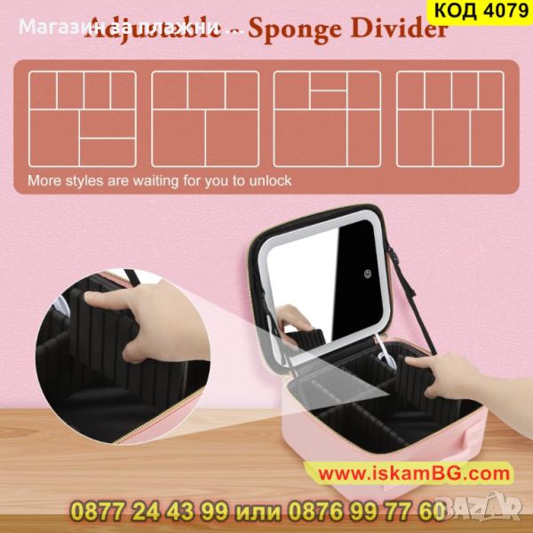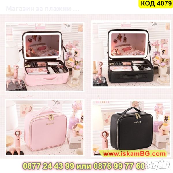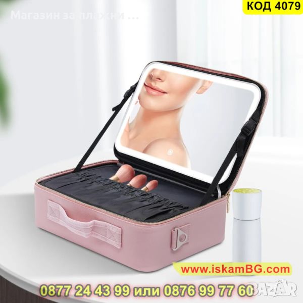 Куфар за грим в розов цвят с LED осветление в три цвята и огледало - КОД 4079