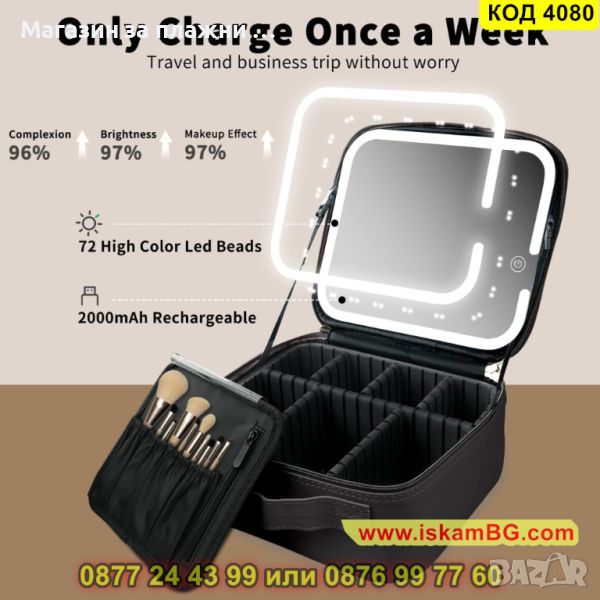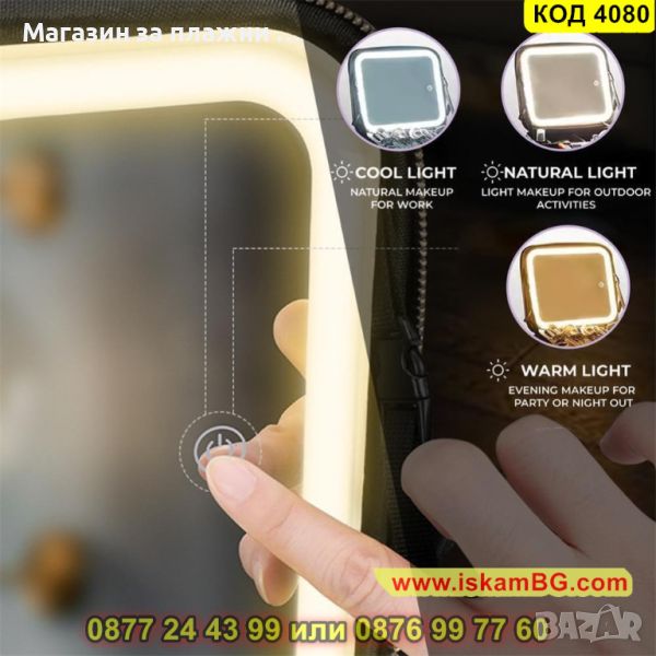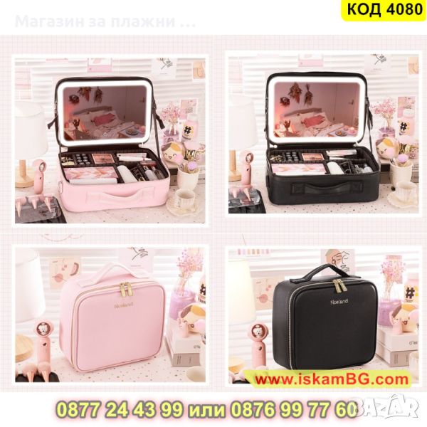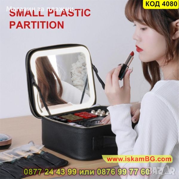 4080 Куфарът за грим, който Ви представяме е един много красив и практичен аксесоар за всяка дама, която обича да се грижи за външния си вид и да подрежда своите гримове. Стилният куфар за грим притежава удобно LED огледало и предлага три режима на светене - топла, студена и неутрална светлина. За да изберете модел на светене е необходимо да натиснете продължително, за да намалите плавно яркостта на светлината или бързо да докоснете, за да превключите цветовата температура на светлината между студена, топла и естествена светлина. Освен това, вградената му батерия 2000mAh има капацитет на работа от едно зареждане да издържи работа една седмица. Разпределението на отделенията може да бъде разместено така както Вие желаете. Куфарчето се предлага в розов цвят и е перфектен аксесоар при пътувания или ежедневно ползване.