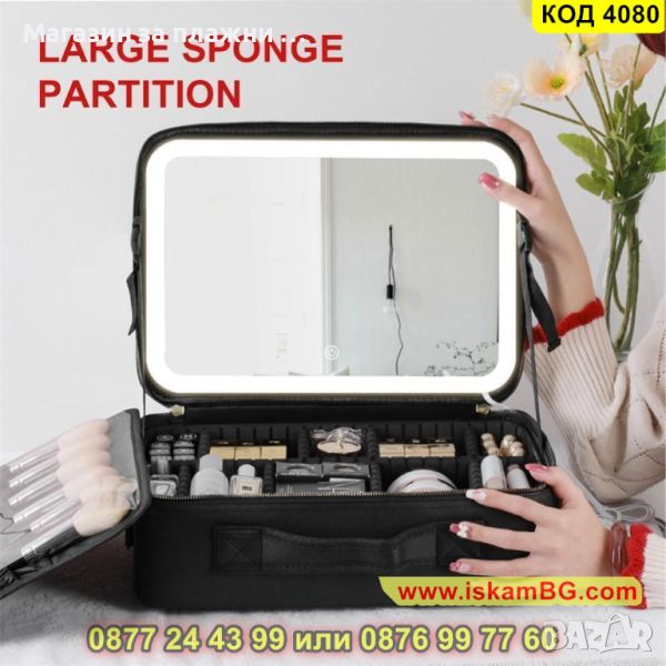 Куфар за грим в черен цвят с LED осветление в три цвята и огледало - КОД 4080