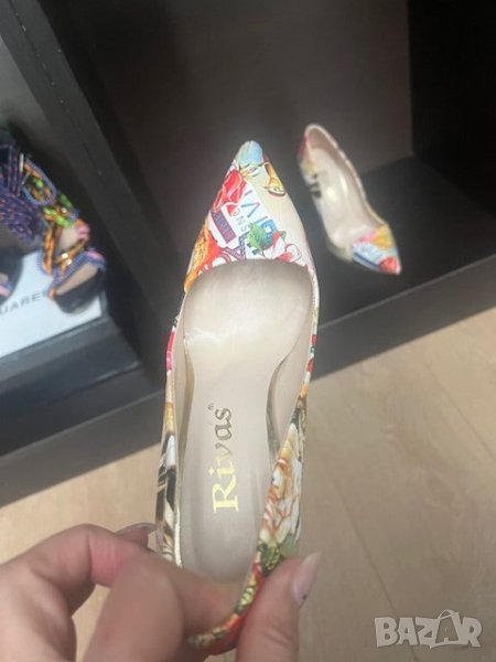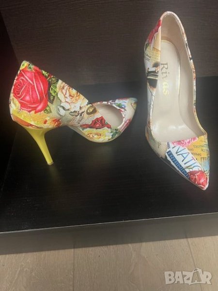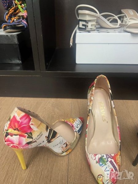 Елегантни цветни обувки на ток с ефектен принт. Еко кожа.