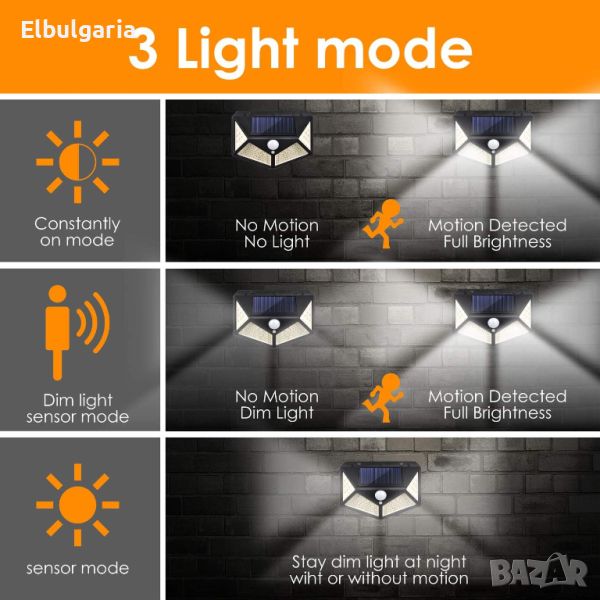 ❤ 3 Режима на осветяване и чувствителен PIR сензор за движение.1) режим на светене при засичане на двежение; 2) Взаимодействие на 1вия режим и лека светлина, когато няма движение; 3) Режим лека светлина, без значение дали има движение или не. Моля, натиснете продължително бутона в горната част за 1 секунда, за да влезете в друг режим. Новата PIR сензорна система за движение и сензорът за движение с широк ъгъл от 180 открива движение от 3 до 5 метра, това е удобство и сигурност за вашия гараж, двор, пътека.