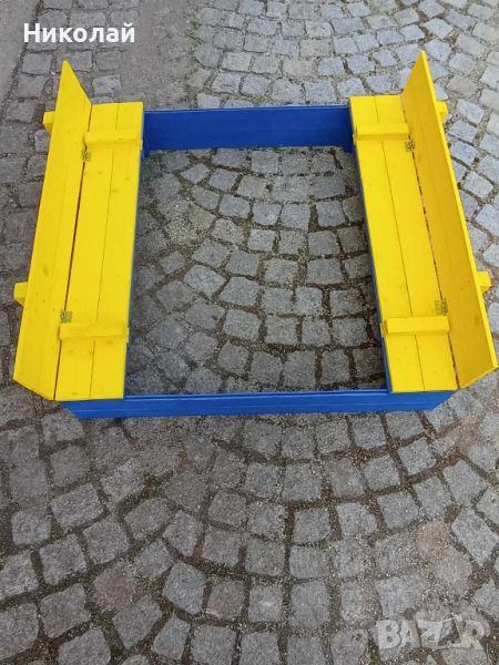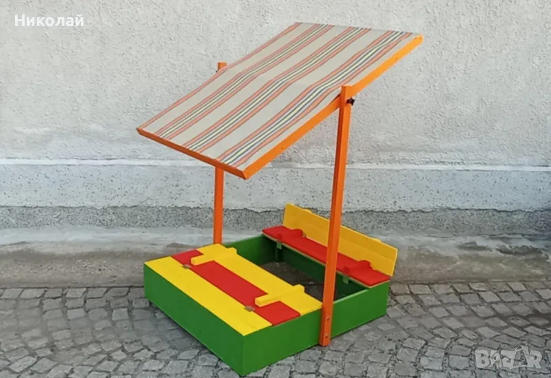пясъчник изработен от дърво със сгъваеми пейки. Покривът предпазва пясъкът от котки, жаби и други замърсявания, захванат е с панти и щом се отвори се получават две пейки за деца.