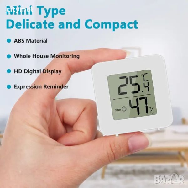 Термометър за стаят или за колата, с вграден температурен датчик и влагомер, изключително полезен във всеки дом, особено в детската стая, където ключът е да се поддържа правилната температура и влажност. Оборудван с голям, лесен за четене LCD екран, който показва най-важните измервания и осигурява общ комфорт в стаята.