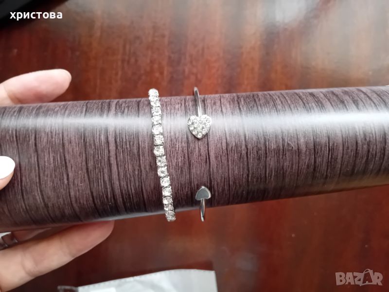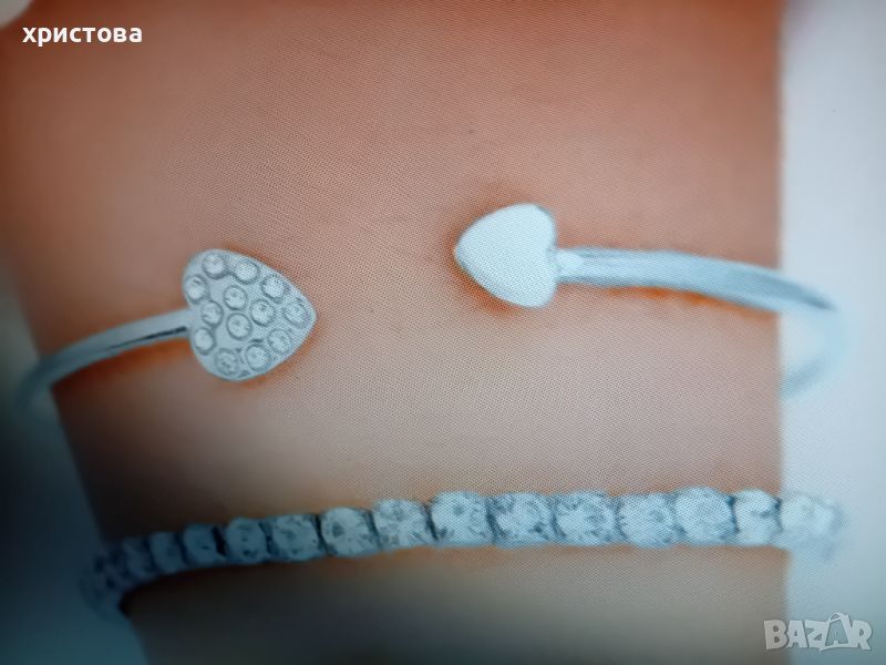1//Две гривнички в комплект,едната е с камъчета на ластик,а др.е разширяваща се с няколко камъчета като роса в/у серцето.Сребрист цвят.За тясна китка.Могат да се носят заедно и с чесовник.-5 лв.