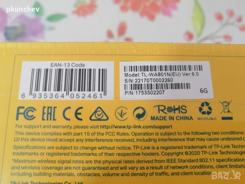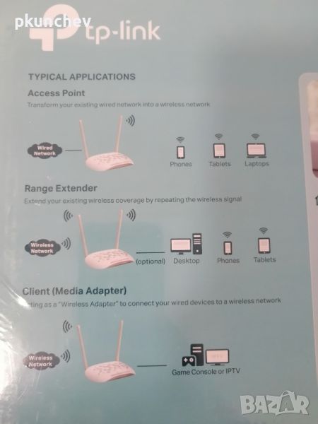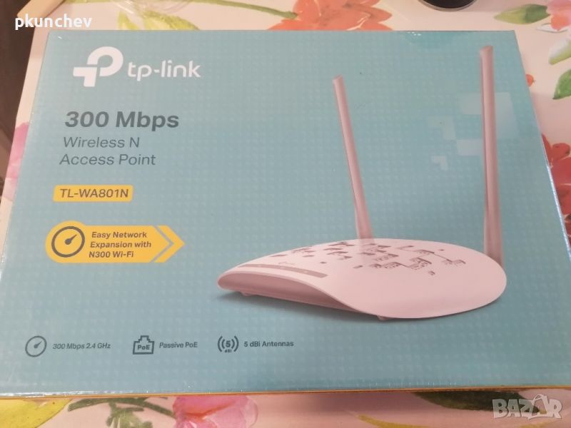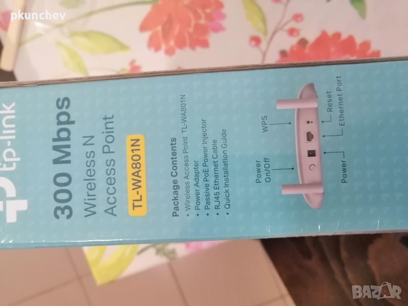Чисто нов, неразпечатан.Безжичната N точка на достъп TP-LINK TL-WA801N е проектирана, за да установи или разшири мащабируема високоскоростна безжична N мрежа, или да свърже множество устройства с Ethernet връзка като игрални конзоли, мултимедийни адаптери, принтери или мрежов сторидж към безжична мрежа. Точката за достъп (АР) поддържа множество различни функции, които правят вашата безжична работа по-гъвкава от когато и да било. Сега можете да се наслаждавате на по-добра работа в интернет, когато изтегляте файлове, играете, стриймвате видео или използвате други приложения.300 Mbps безжична скорост, идеална за плавно HD видео, стрийминг на глас и онлайн игриПоддържа множество режими на работа: Точка за достъп, Мулти-SSID, Клиент и Удължител на обхватЗащитава вашата домашна мрежа с WPA2 криптиране и осъществява бързи връзки с натискането на един бутонДо 30 метра (100 фута) гъвкаво разполагане с включен инжектор за Пасивно захранване по Ethernet