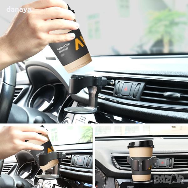 Поставка за чаша за кола – практичен авто аксесоар. Универсална стойка за чаша кафе, чай, кен кола, закачаща се за решетката на парното. Стойката притежава пружинна пластина, която уплътнява чашата и не и позволява да мърда. 2 броя кукички държат здраво поставката за напитки към таблото.