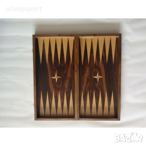 Табла за игра с кутия от орех с фурнировано игрално поле. С дъбови пулове и пластмасови зарчета.