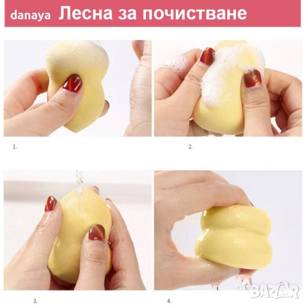 След като приключите с грима просто трябва да изплакнете гъбата във вода, докато от нея се отмие всичко. Гъбата трябва да се сменя на всеки 3 месеца.С гъбата лесно можете да поставите фон дьо тен, коректор или течен хайлайтър.