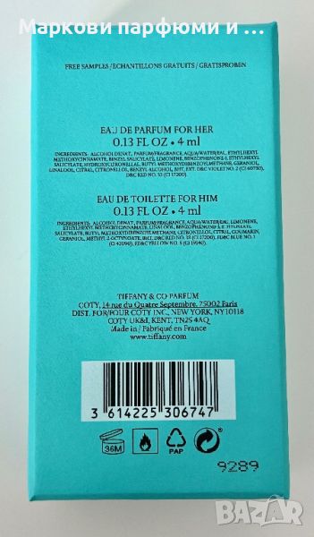 Tiffany&Co - промо комплект парфюм за нея и за него-2 броя мини парфюма по 4 мл, дамски и мъжки, 27€ на топ марката Tiffany&Co.