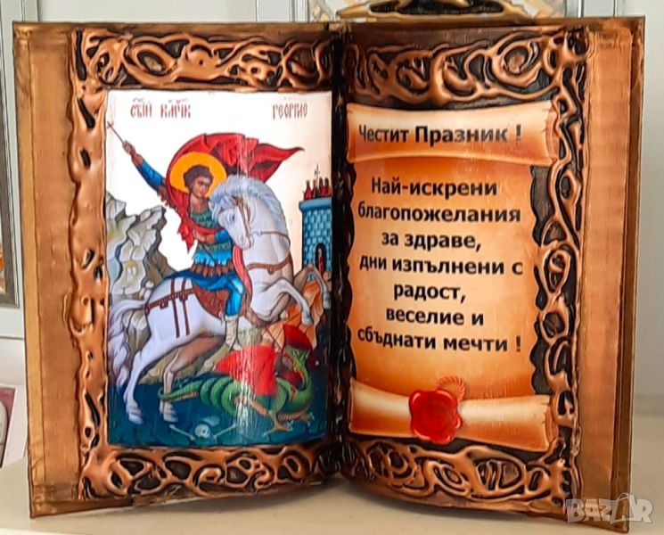 Авторски, ръчно изработен комплект от книга-икона със Св. Георги и оригинално пожелание за всеки повод, и празник - рожден или имен ден, юбилей, Гергьовден и др. в съчетание с бутилка