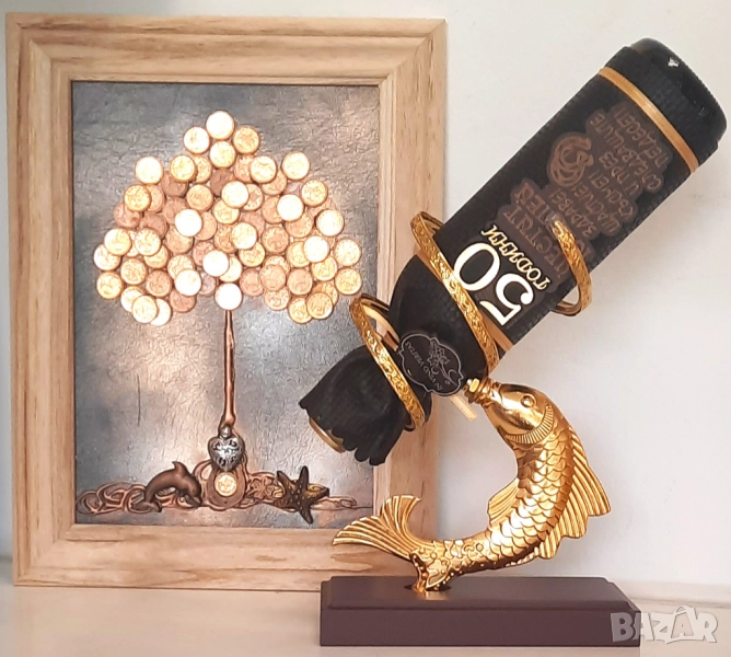 Комплект със Златна риба от месинг и махагон