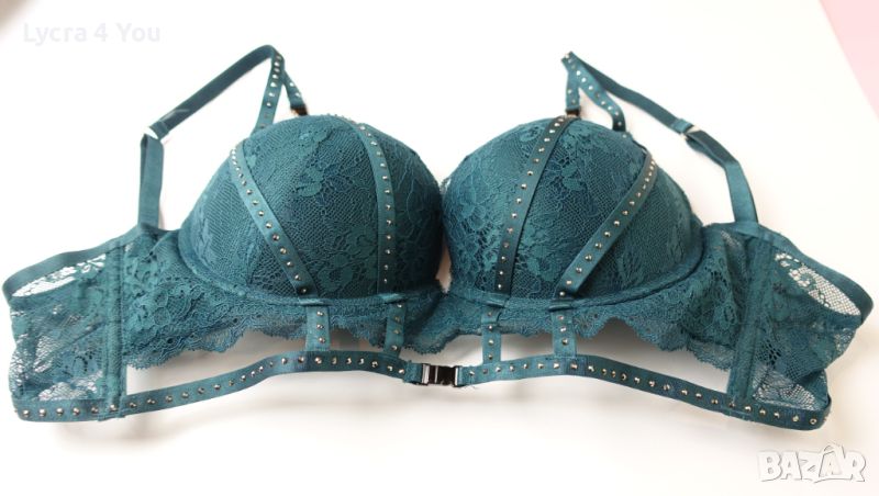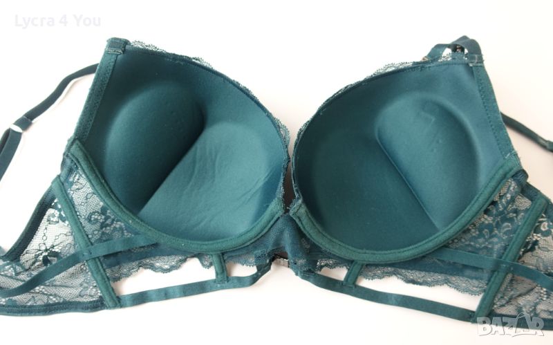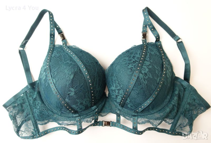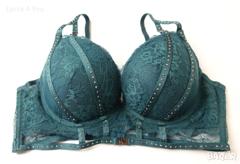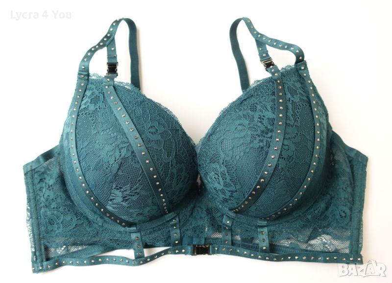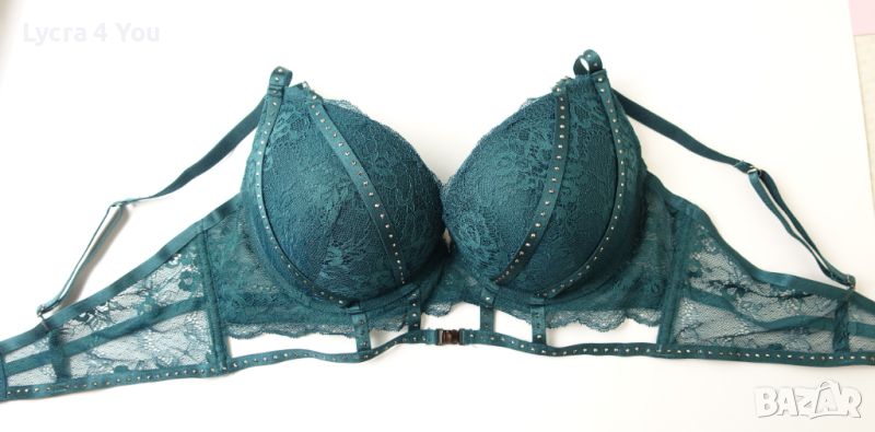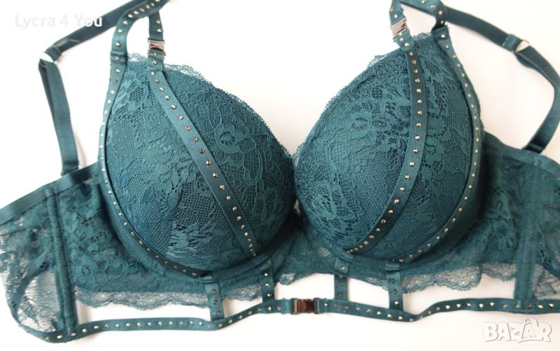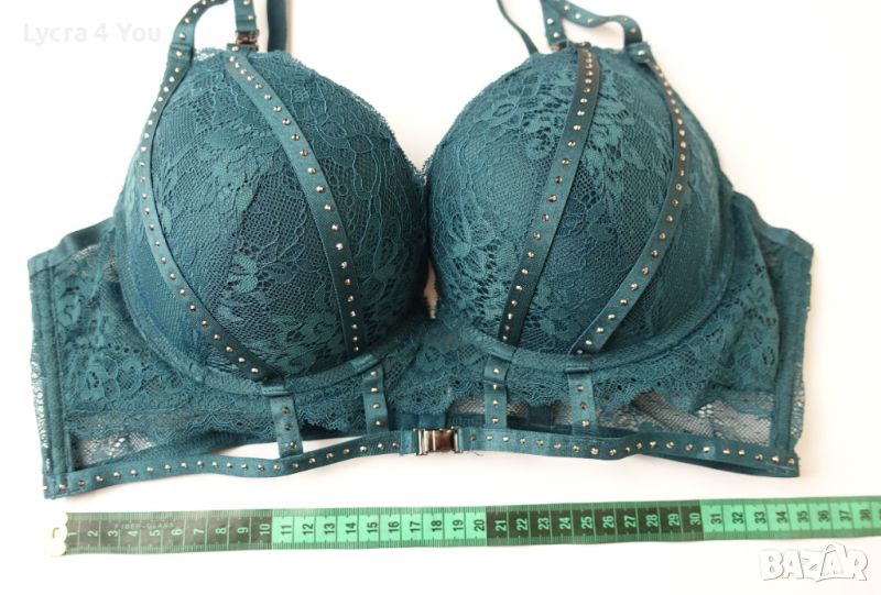 Сутиенът е с твърди обемни чашки с подплънки и е покрит целия с дантела. С метални елемент по ластиците на чашките и периферията.
