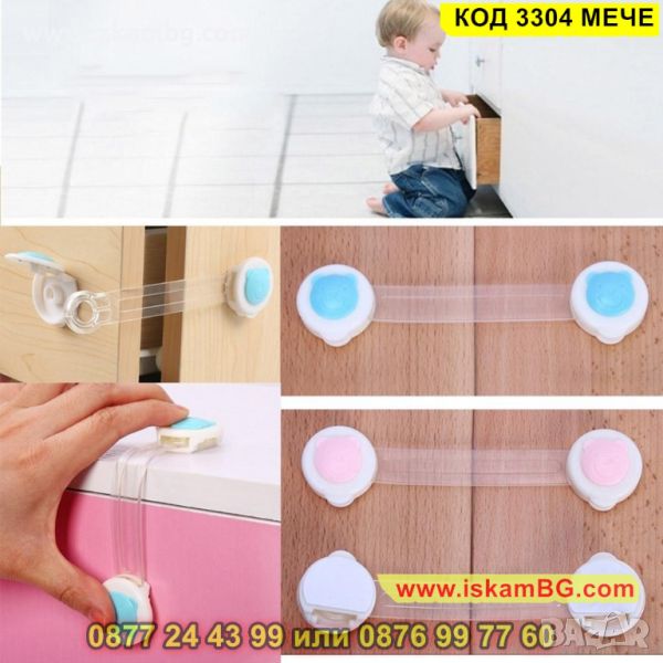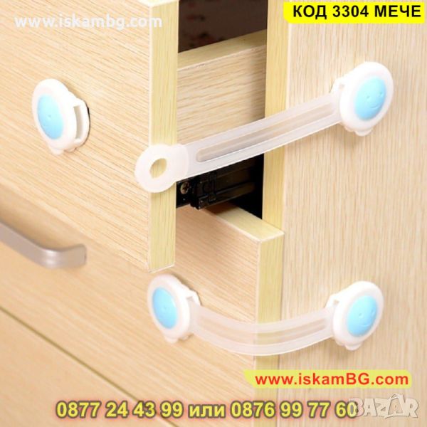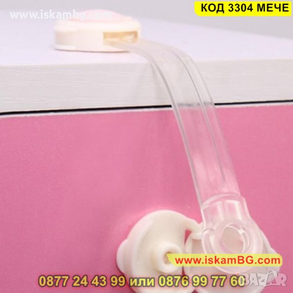Комплектът включва 1 механизъм с дължина 14 см. Използвайки го можете да бъдете спокойни, че детето ще бъде в безопасност, дори ако се опитва да отваря гардероба, хладилника или шкафчетата. Поставя се лесно върху всякаква повърхност (метал, пластмаса или дърво). Монтира се от външната страна на мебелите.