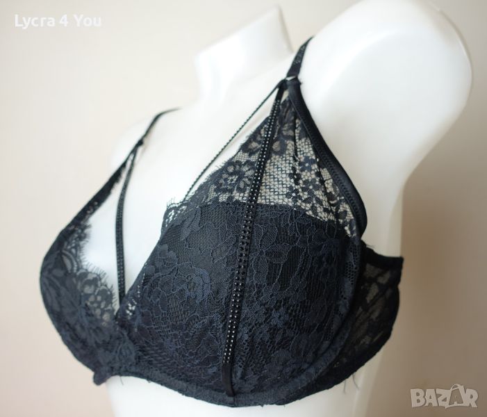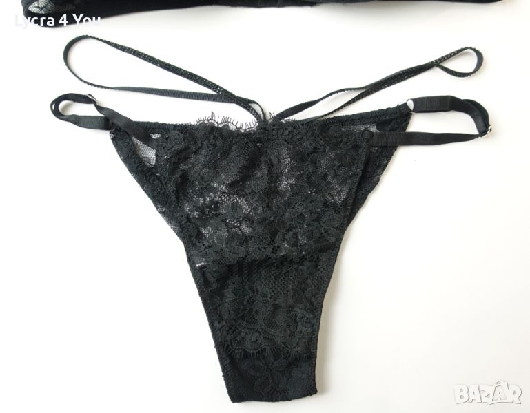 Страхотен дамски комплект бельо на Intimissimi включващ сутиен и изрязана бикина тип бразилиана от дантела, с ластични чокъри покрити с камъчета в черен цвят.