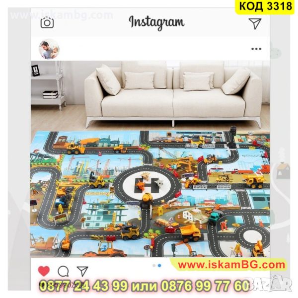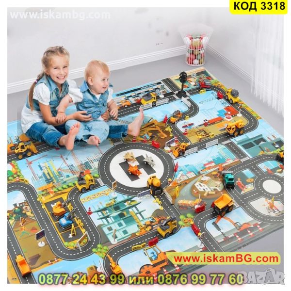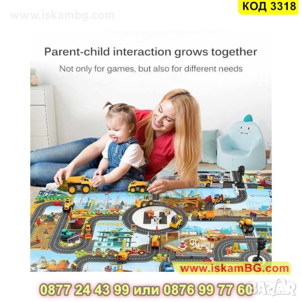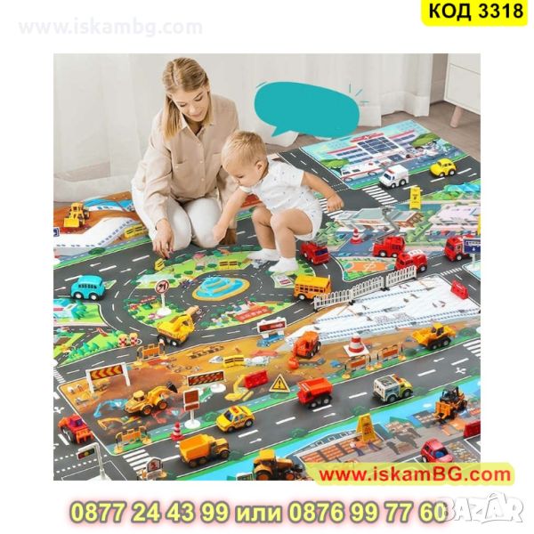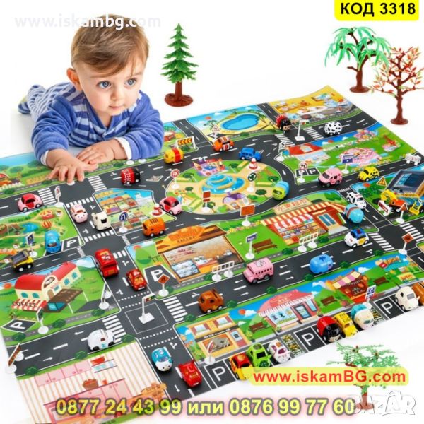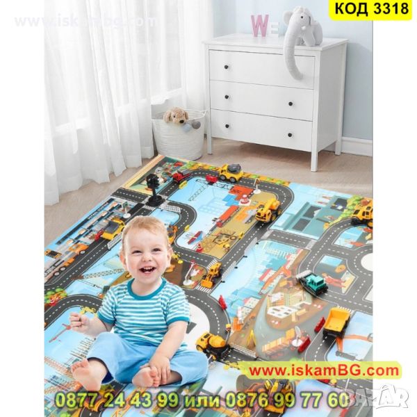 Детският килим – постелка за игра под формата на писта с различни камиони, колички, динозаври и други фигурки ще стане любима постелка на Вашето дете. Тя го захласва със своя дизайн и ще насърчи детето Ви да си играе. На тази постелка, също така, има и нарисувани сгради и улици, парков и места за паркиране, които наподобяват реалността. Нашето килимче постелка ще научи детето как да се справя с реални ситуации на улицата, спазвайки и правилата за движение. Лесно се сгъва и се прибира, незаемайки място, когато детето не я ползва и можете да я вземете навсякъде с Вас, защото е компактно.
