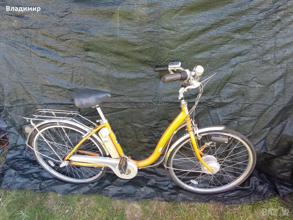 SANIO.Запазено като ново,всичко оригинално,3скорости,три степени на ел. подпомагане,зареждане на батерията при движение.Заключване на батерията и задна капла.Баъерията има ток.Гумите като нови-24".Алуминиеви капки и рамка.За друго-0988221225