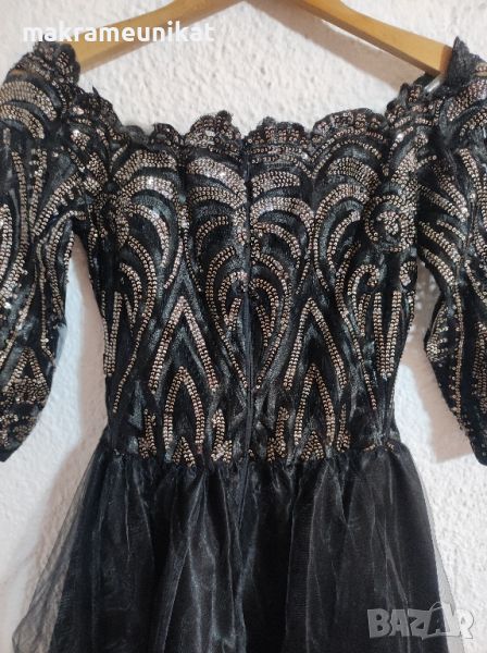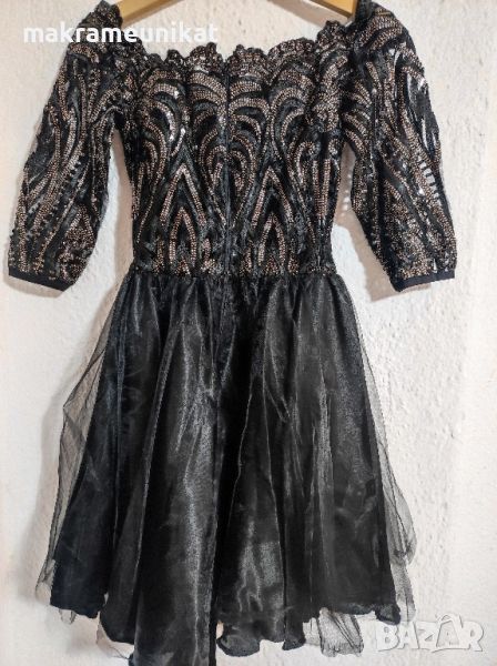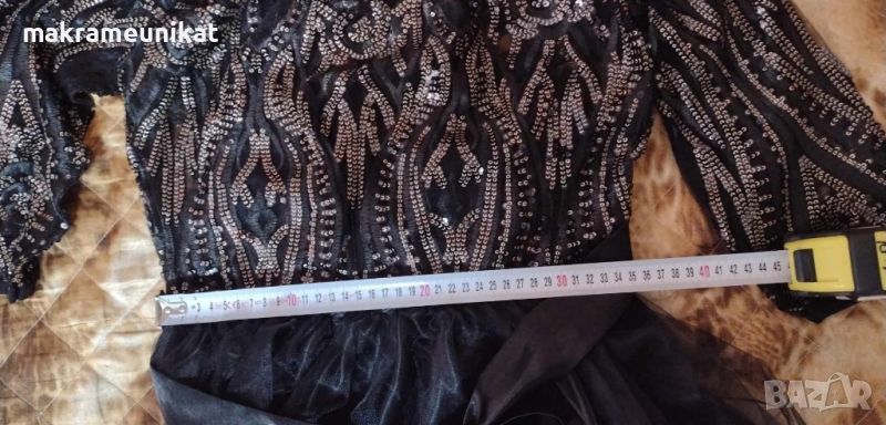 Продавам чисто нова рокля, черен цвят, с разкошна декорация от тюл и пайети, маркова, размер SM, M (38-40), дължина над коляното, показано на снимка с манекенката. Точни размери в сантиметри вижте в снимките.