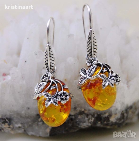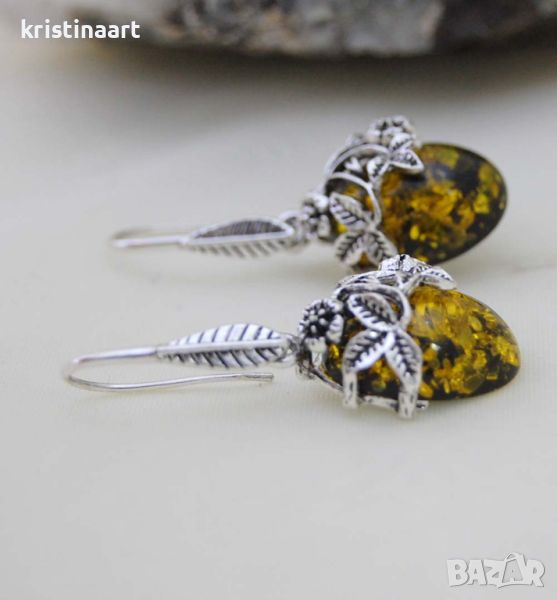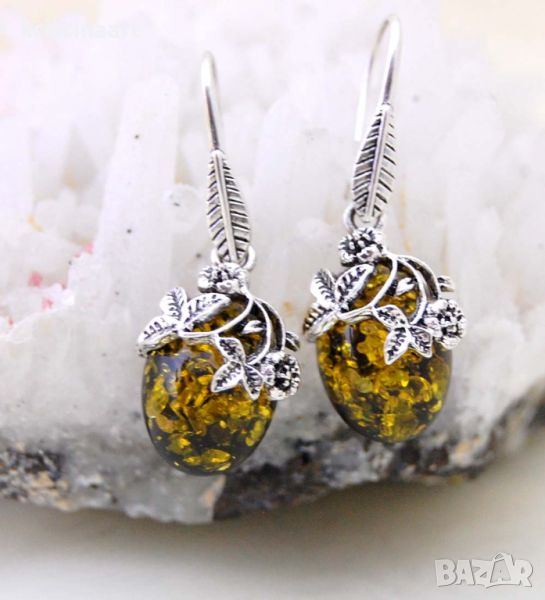 Обеци от зелен и жълт кехлибар *Ретро стил*,40мм