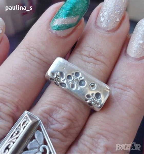 2️⃣. Винтидж / Масивен семеен сребърен пръстен проба 925 с циркони от СБХ на 40г. Цената е крайна 59,99лв. Инкрустиран асиметрично с цветя. Пръстенът е стеснен, няма дефекти, перфектен и много красив. Размер 16,2мм. Не се продава на грамаж!