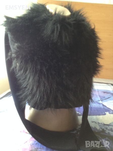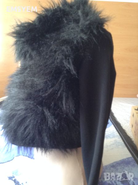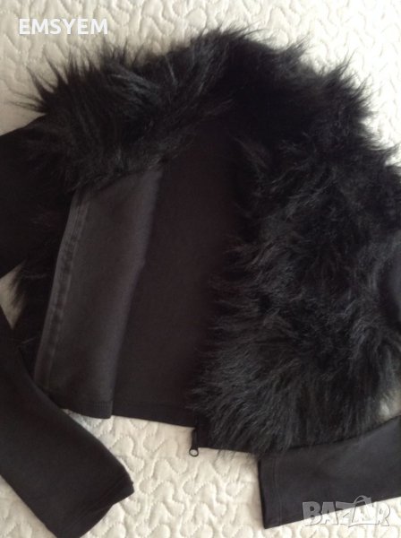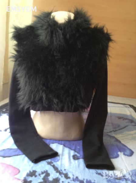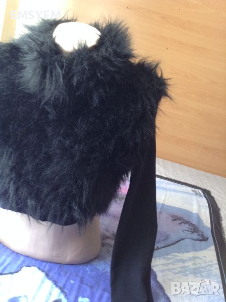 Късо болеро, черно , еластично , предницата е с изкуствен дълъг косъм.черно .- гръб , от рамо дод рамо - 37 см. в свободно състояние - гръдна обиколка - 86 см.- дължина 35 см.- дължина ръкави - 60 см - с цип в отлично състояние