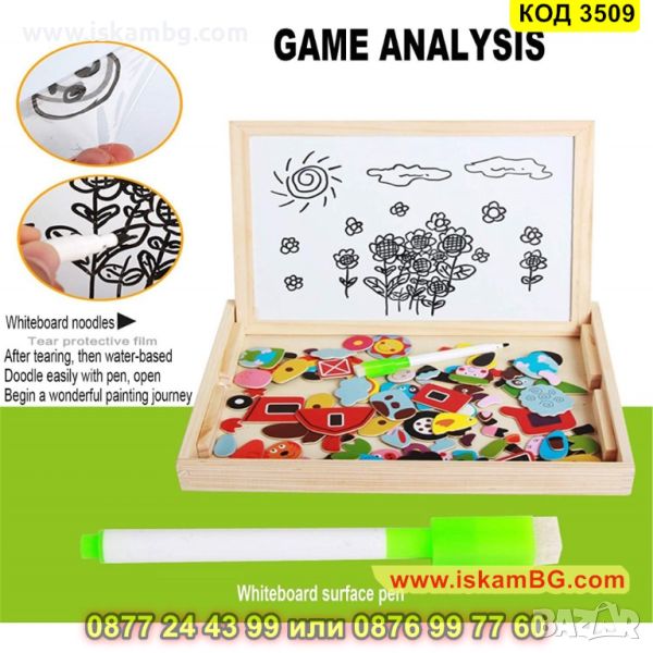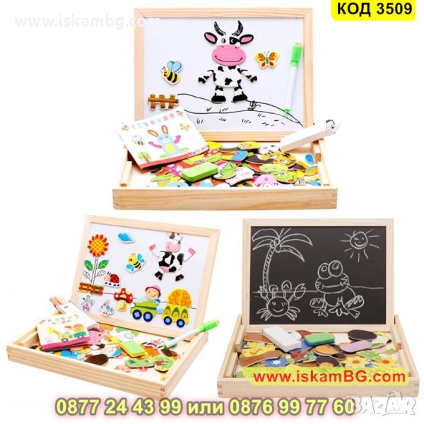 Едната страна е бяла за рисуване с флумастера и нареждане на магнитните елементи, а другата е черна за писане и рисуване с тебеширите.