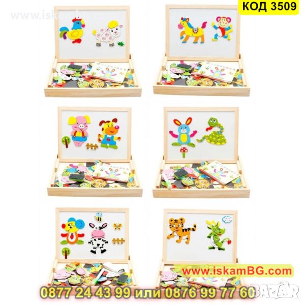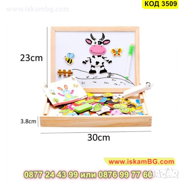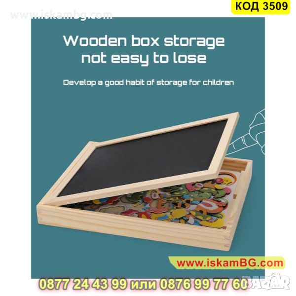 Комплектът съдържа кутия с магнитен капак - дъска, цветни дървени магнитни елементи за подреждане, книжка с примерни модели, флумастер с изтриваща част, три тебешира и гъбка за изтриване.