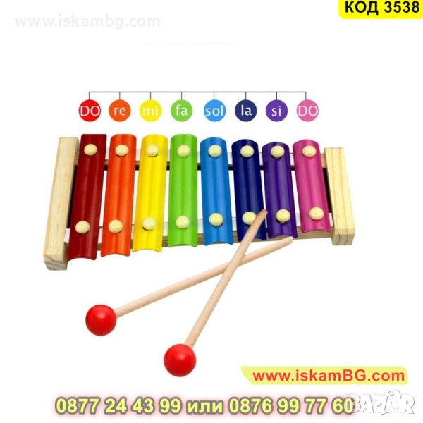Музикалната играчка ксилофон представлява масивна дървена основа. Към нея са прикрепени осем цветни дървени пластини, добре закрепени, с верни тонове, една октава. Всяка пластина възпроизвежда различен тон. Удряйки ги детето развива уменията си да разпознава и да улавя разликите между тоновете.