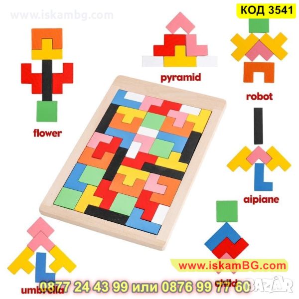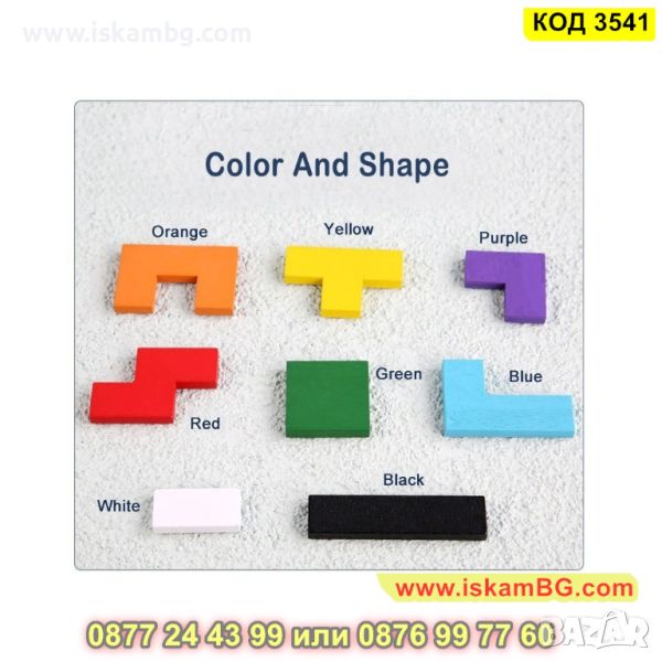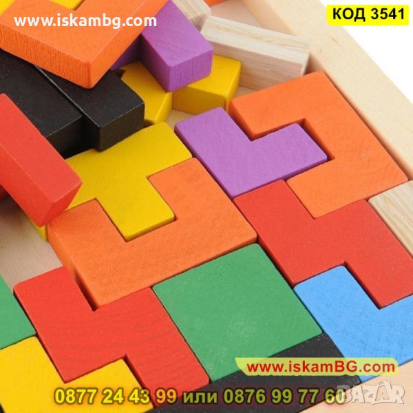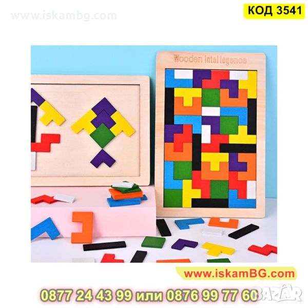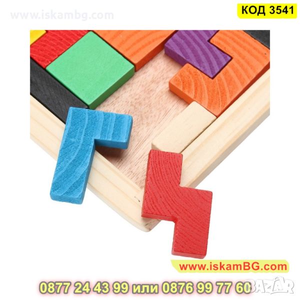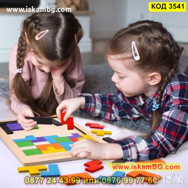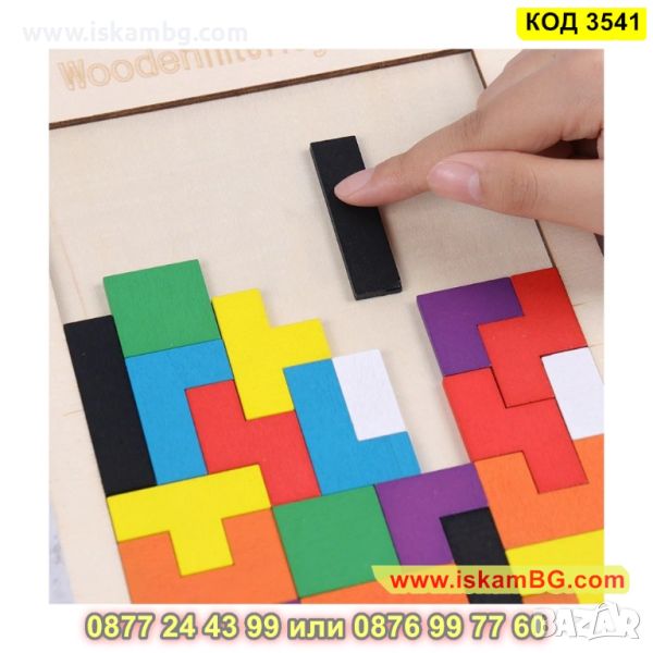 Дървената игра Tetris с цветни дървени кубчета с различни геометрични форми, които трябва да се комбинират в дървената опорна кутия, за да оформят цялостната картина, подходяща за всички възрасти.